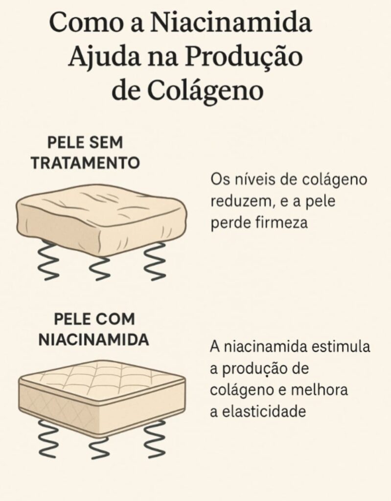 Agora imagine que a niacinamida é como um “técnico de manutenção” que entra silenciosamente e começa a reparar as molas quebradas, fortalecer as que ainda existem e impedir que novas quebrem. Com o tempo, o colchão começa a recuperar a firmeza. Não volta a ser novinho em folha, mas fica muito mais estruturado, bonito e confortável.